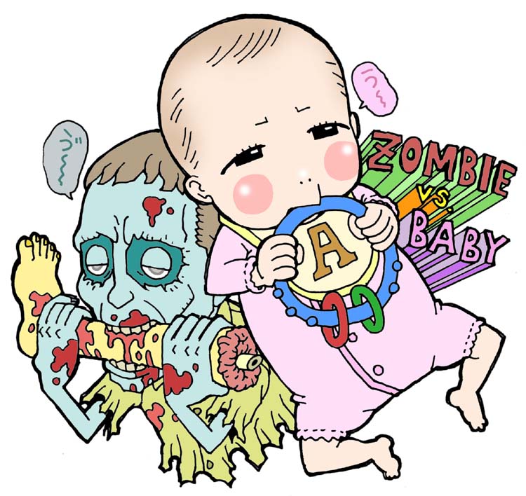 咬む事も憶え、指だったり腕だったり突然咬んで来るので驚かされる事もしばしば。自分の足を掴んで舐め回す仕草は掴み舐めが出来るようになってから今だに続けているのですが、ふと「おいしいのかな?」と妙な疑問が浮かんで来ました。以前たまたまベビーベッドでオシメを替えている時に私の口に愛娘の足が入って来て若干しょっぱかった事を思い出し「塩味がおいしいから自分の足でも舐めちゃうのかな?」という考えが頭をよぎり、そこからゾンビが人類を食いつくして最終的に自らが自らの体を食べてしまうと言う、最後の最後まで“飽くなき食を示す恐ろしさ”を描くのもゾンビの終末観にはふさわしいエンディングなのかもしれないと考え至りました。そう言った作品に私は出会っていませんので出会える日を楽しみにしています。まだまだゾンビを描ける余地は残っていそうです。