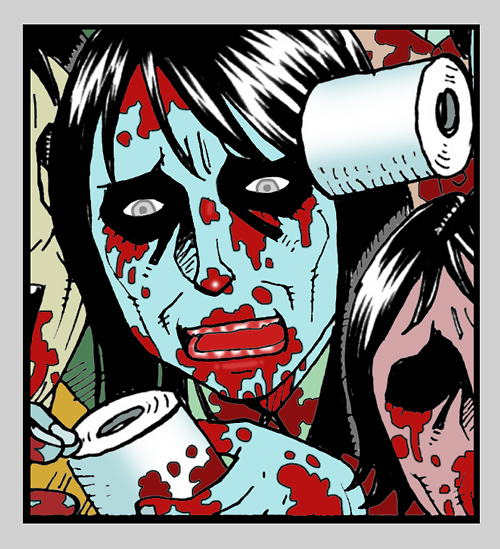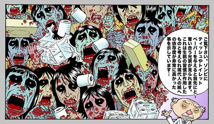 上の画像はオイルショックでトイレットペーパーを奪い合っているイメージからの一コマですが、それをゾンビに置き換えてみたらゾンビ達はこうなるのかもしれないとふと思いつきました。ゾンビ最大の謎“食べたものの排泄はどうなっているのか”ですが私は腹の中で腐って垂れ流される説を推したい所です(笑)。2012年2月2日にも同じようなニュアンスで「TWITTER OF THE LIVING DEAD」の投稿をしていまして