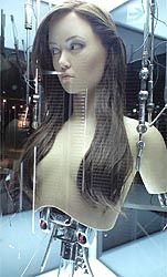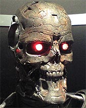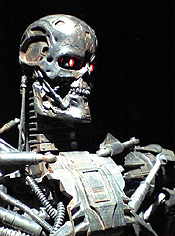 金属骨格に、シュワちゃん顔のターミネーターの実物大三体並んだ